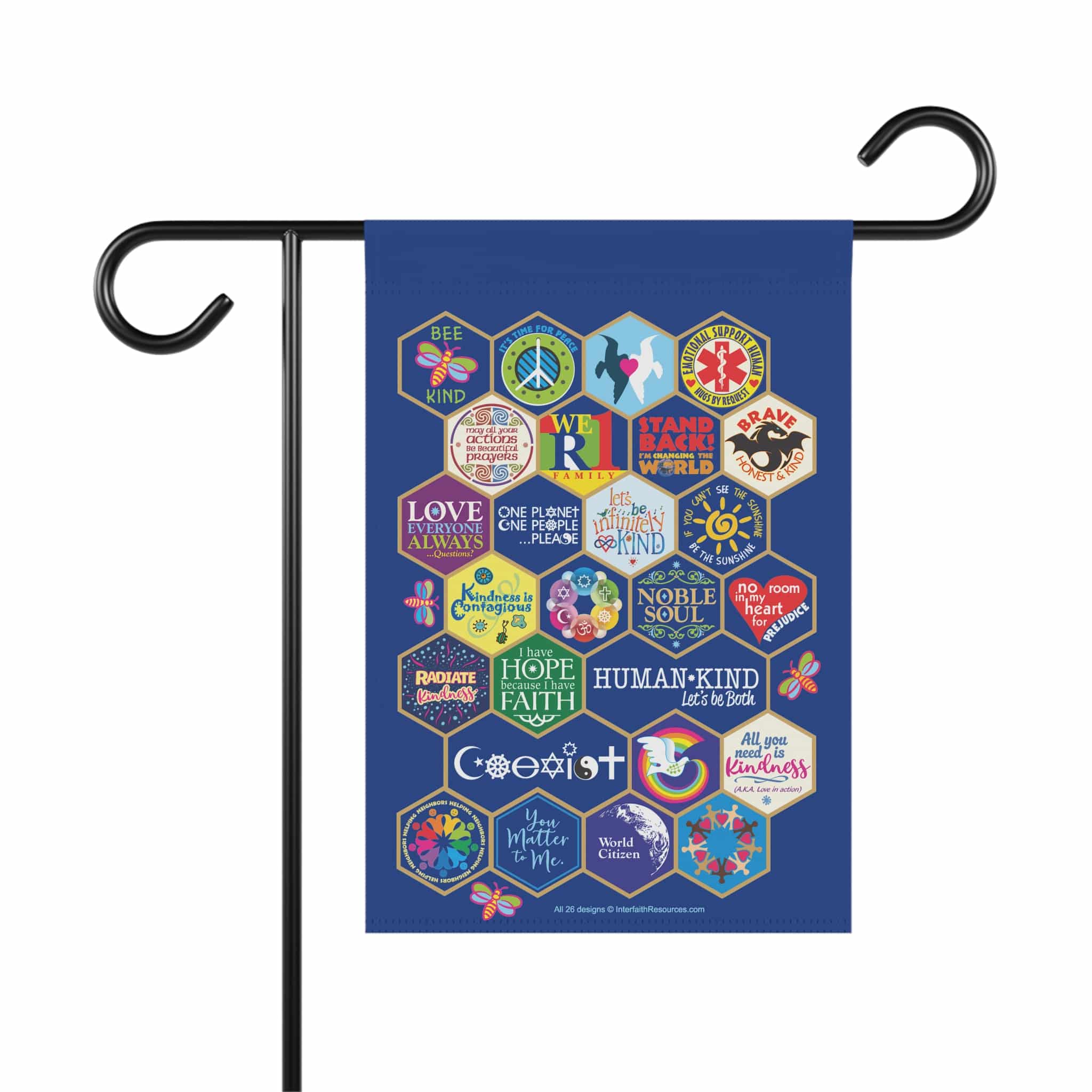 The design incorporates 25 (for the large flag) or 26 (for the garden flag) of our most popular design themes in a honeycomb quilt pattern. This has been extremely popular as a T-shirt and zipper hoodie, where it is printed on the back. These represent just a few of the 100+ unique designs we offer individually on a variety of other products – including other flags. All designs are copyrighted.