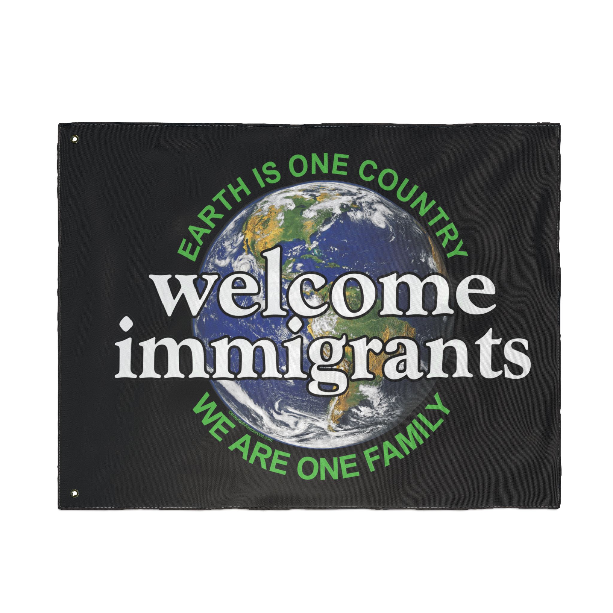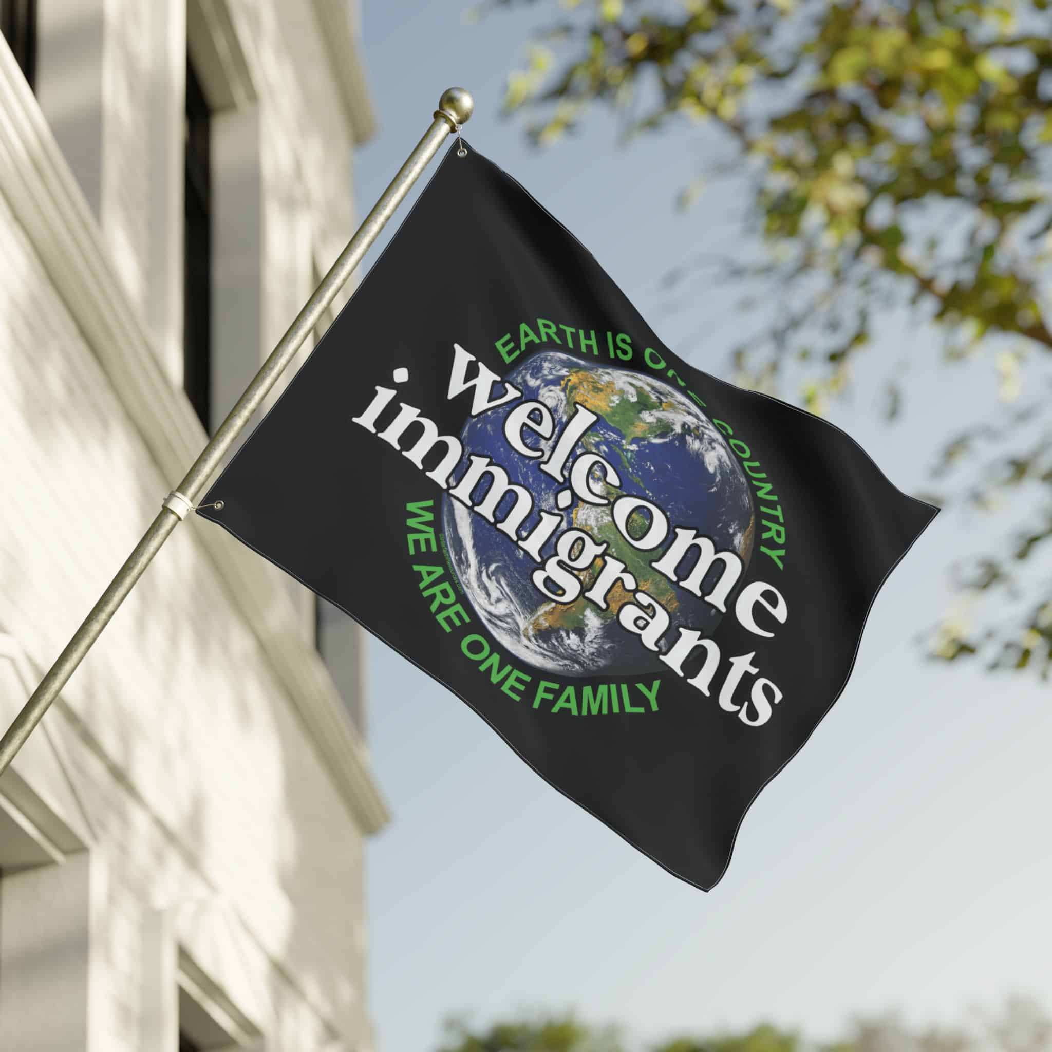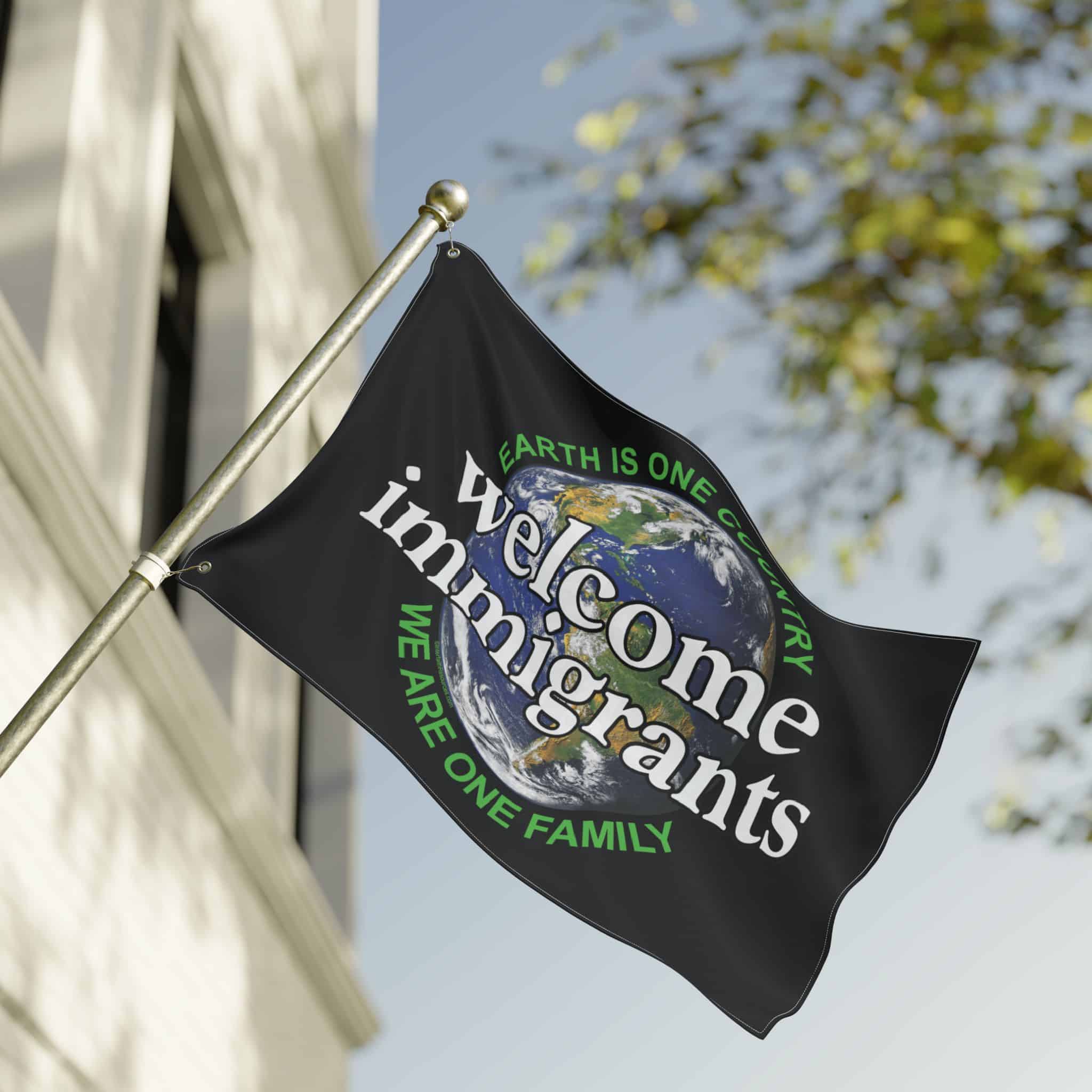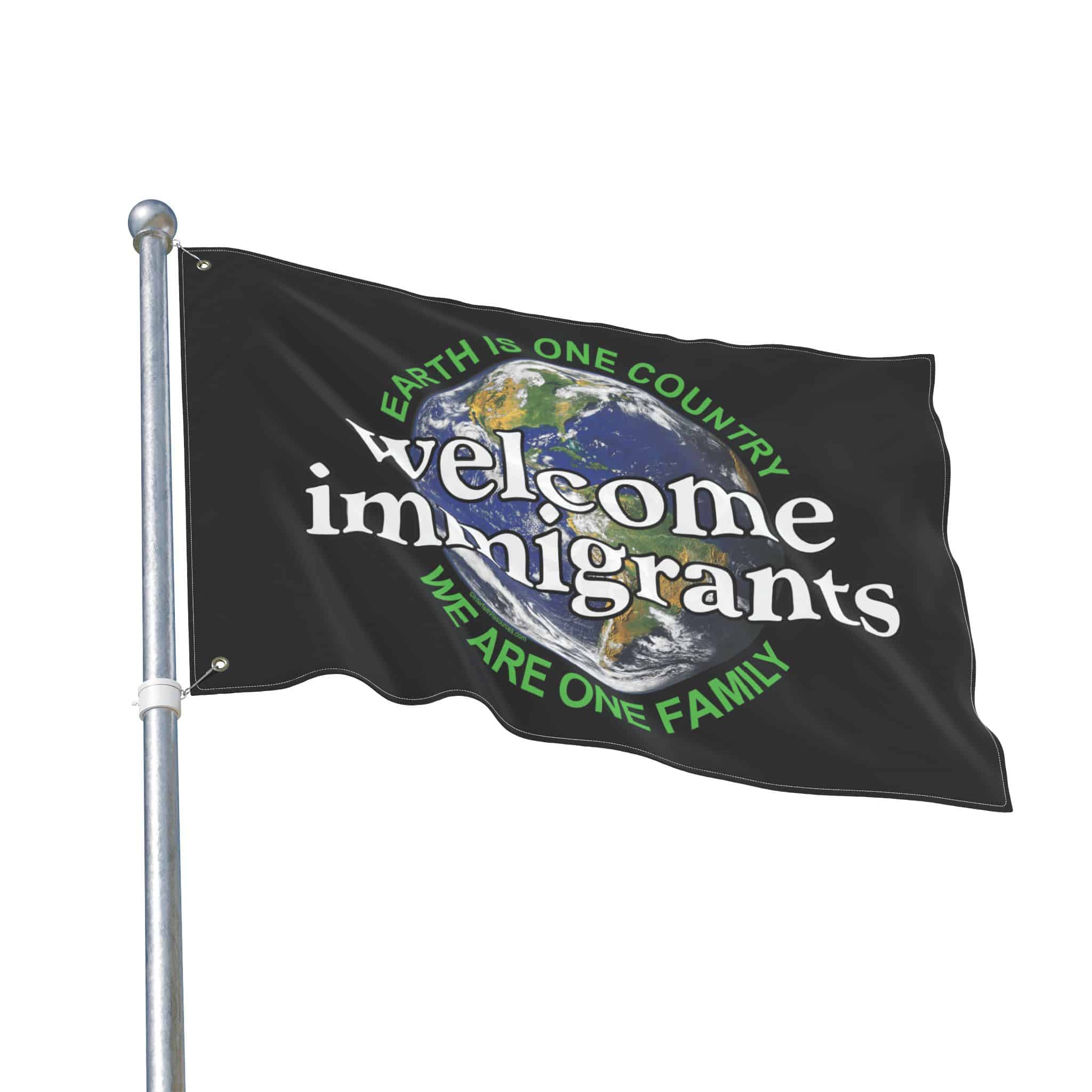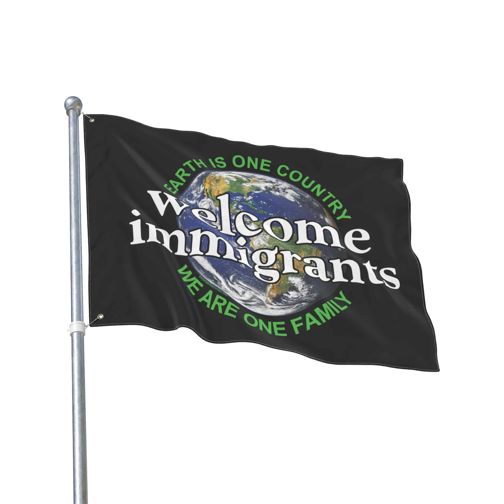 This two-sided flag is designed to be extremely versatile. It can be flown from a flag pole, or carried either vertically or horizontally in a parade or pre-immigration rally. One side has the design oriented vertically to make it easy to carry. The other side has it oriented horizontally to make the message as big as possible. Either way, it is light enough to be displayed by one person. It can also be mounted on cardboard or foamcore and set on the ground.