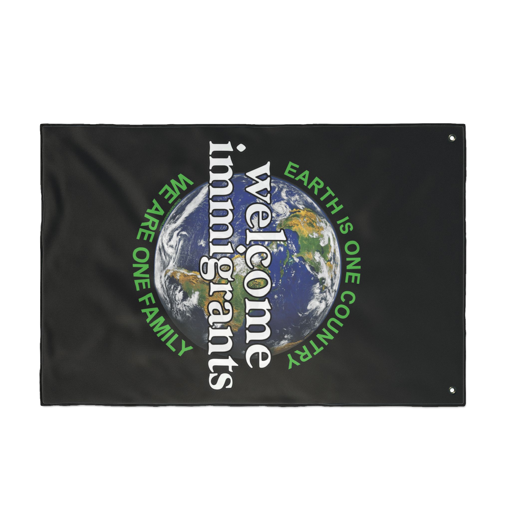While others may be carrying hand-made signs with tiny unreadable messages that are sometimes negative in nature, this flag will stand out at a distance with a strong positive statement. The wording around the earth says “Earth is one country” and “We are one family.”