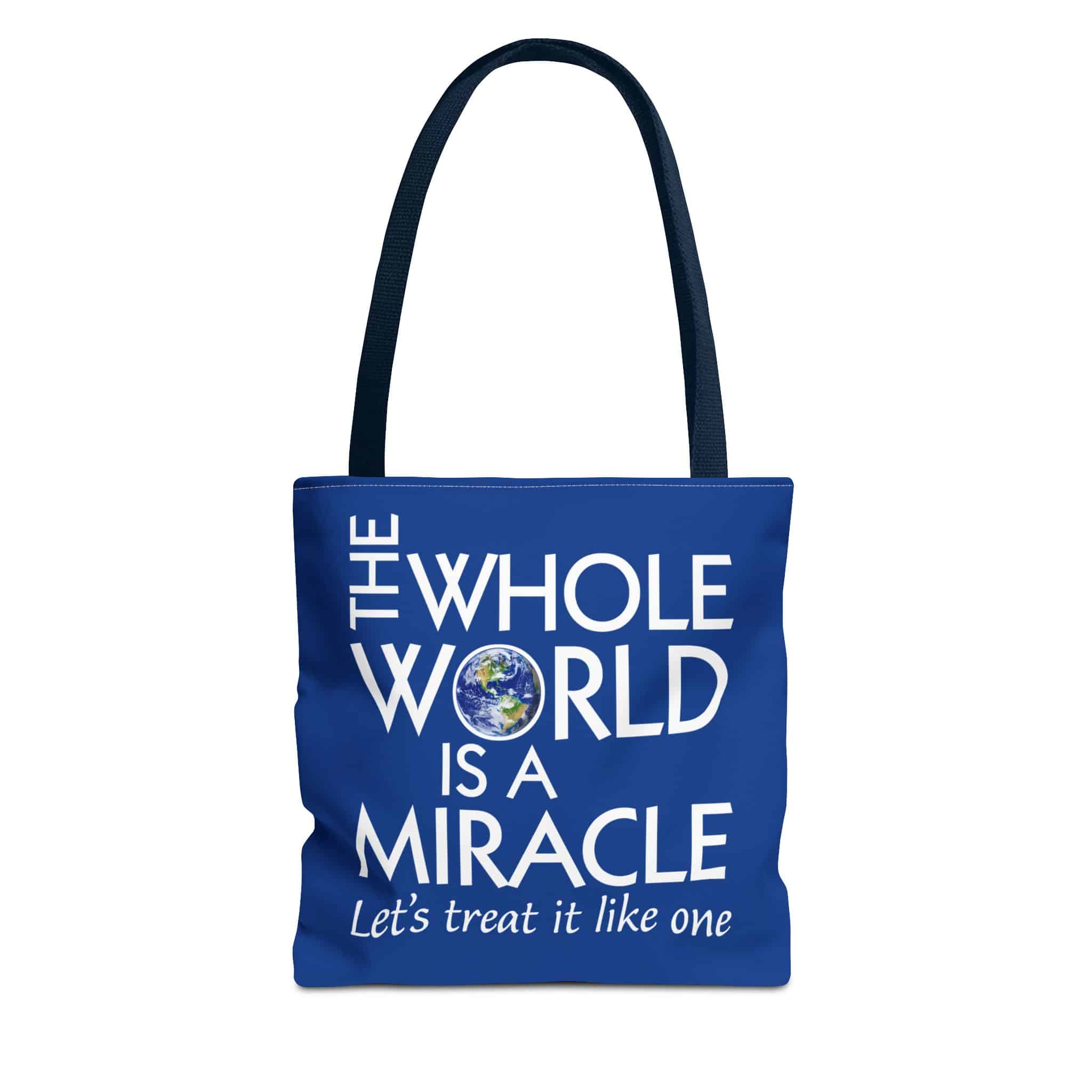 A tote bag for people who love Mother Earth. One side says Love Your Mother, with pictures of the earth in all three “Os.” The other side says The Whole World is a Miracle – Let’s treat it like one,” with an earth in the “O” of “world.”