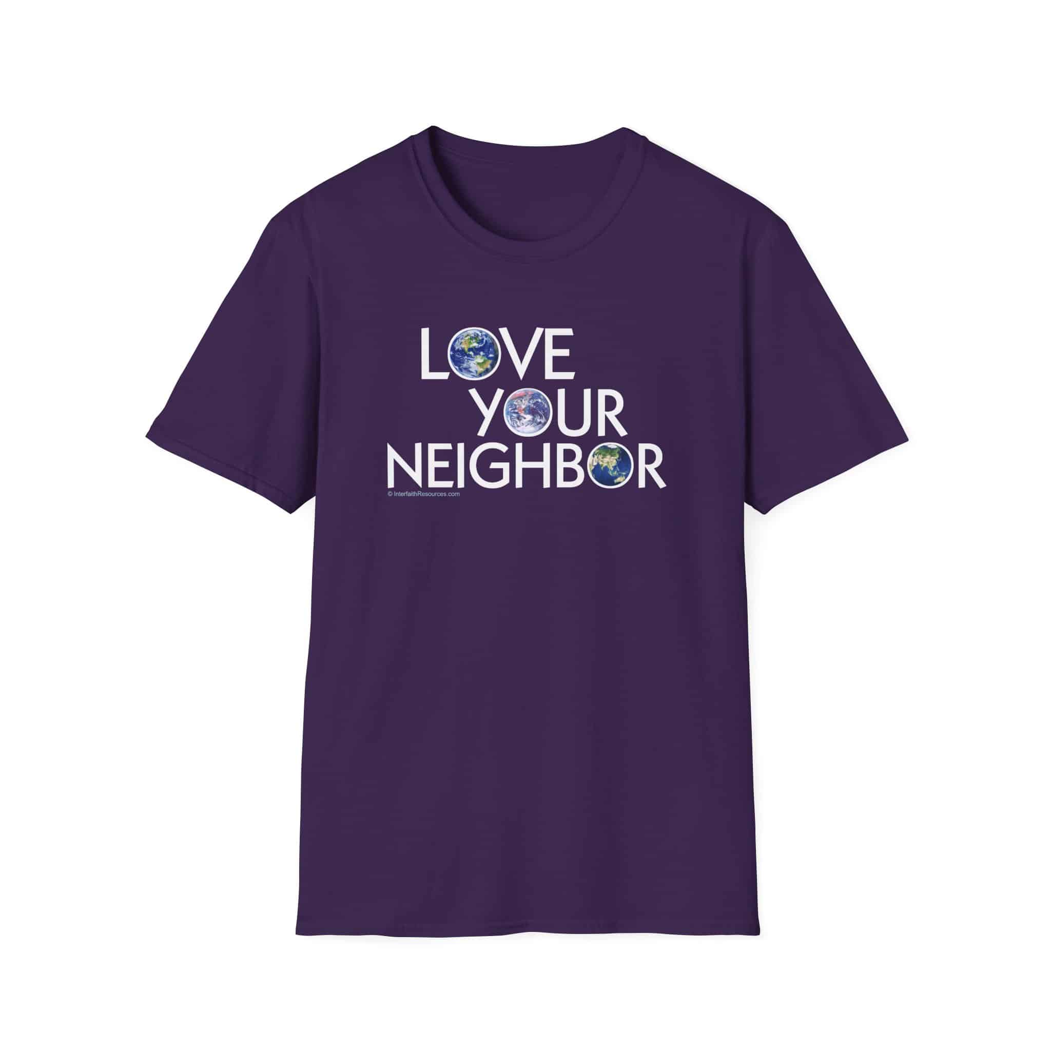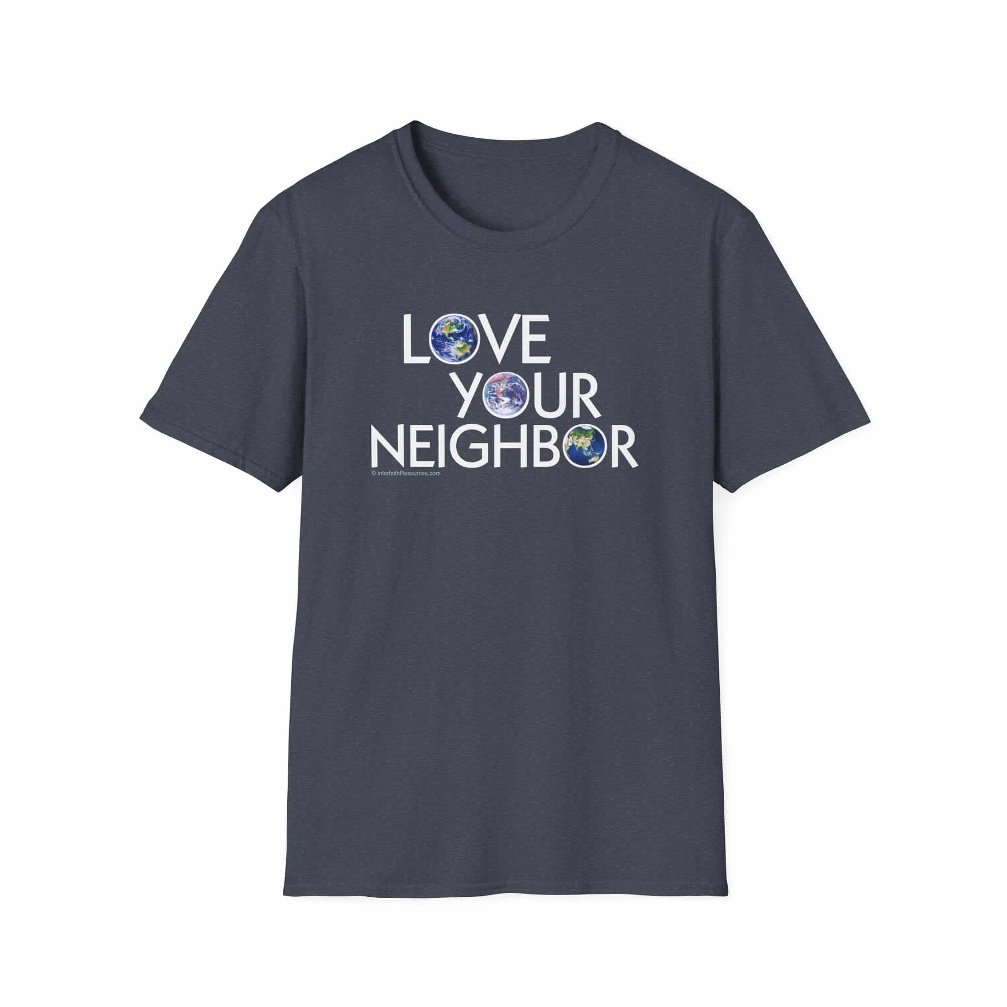 The “Love Your Neighbor” design with globes in each of the three “Os” highlights the idea that everyone in the world is our neighbor. The three globes present different hemispheres, including virtually every country in the world (sorry New Zealand). It comes in 7 colors.