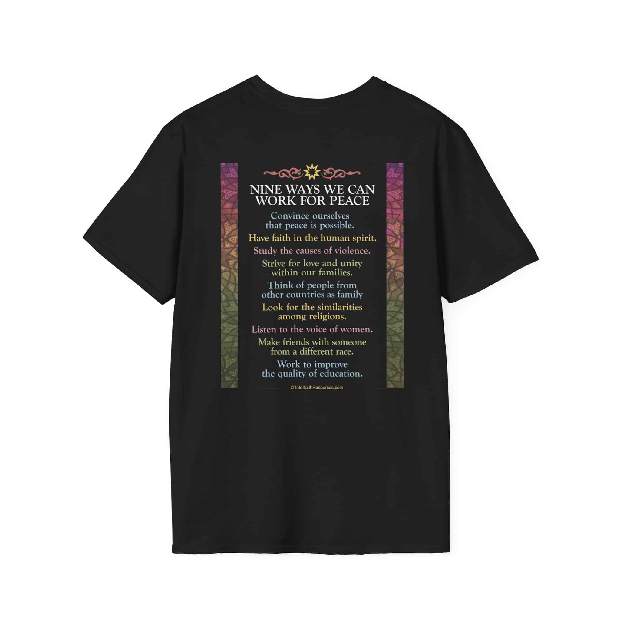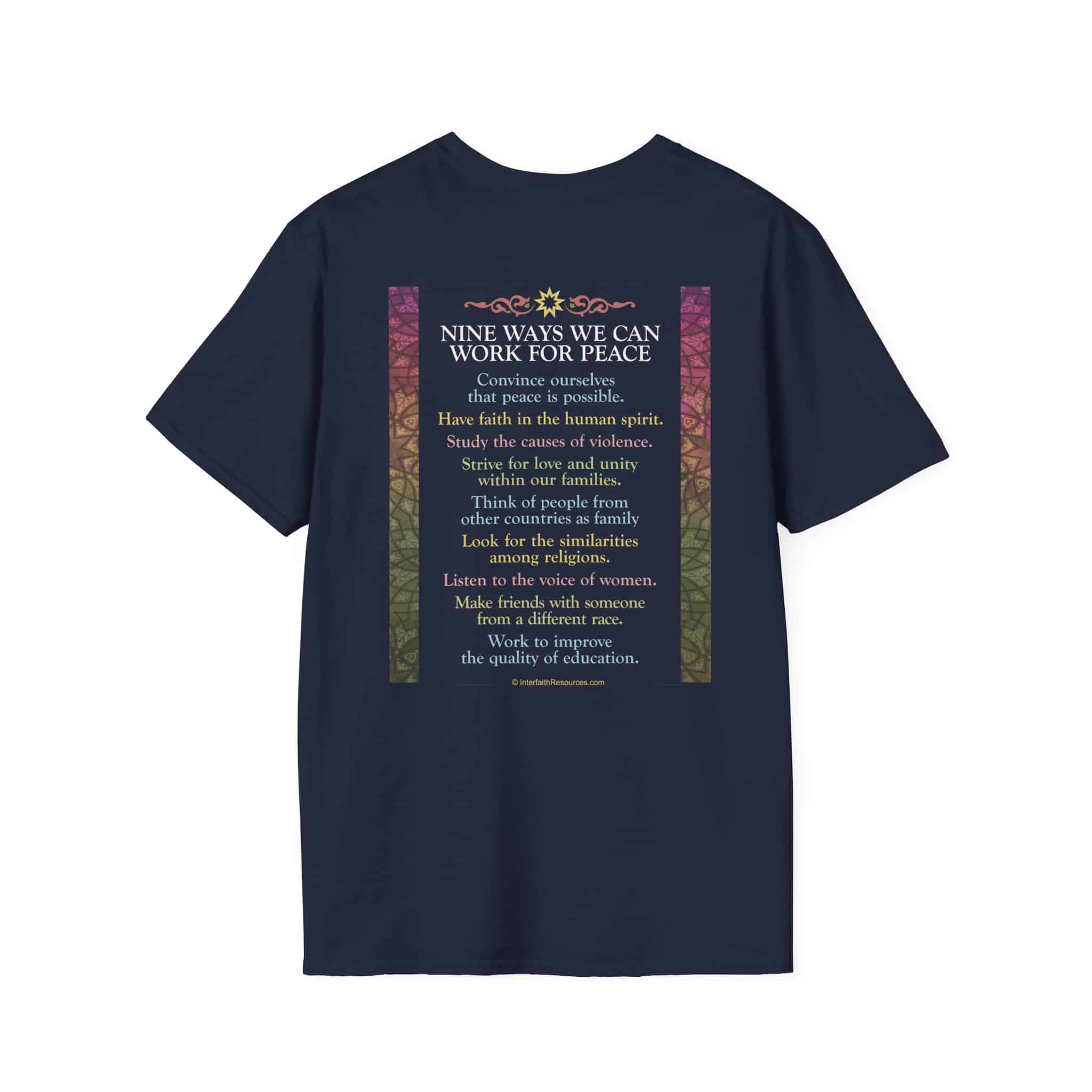 NOTE: The Black and Forest Green shirts only print on the BACK and are less expensive. The NAVY shirt includes the words “I work for peace” on the FRONT as well, and costs extra for the second print.