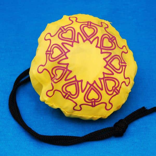 The bag is made of strong but light-weight woven polyester, and has two built-in handles for easy carrying. When you are done using it to carry things, just tuck it into the corner pouch and pull the drawstring. Then loop the drawstring around your purse strap, laptop handle or belt loop and it will be there next time you need it.