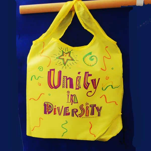 Unity in Diversity is printed in quirky letters in purple on a bright yellow bag. The attached carrying pouch has the outlines of the People and Hearts design. It comes as it is pictured in the first two pictures. The bag makes a positive statement all by itself.