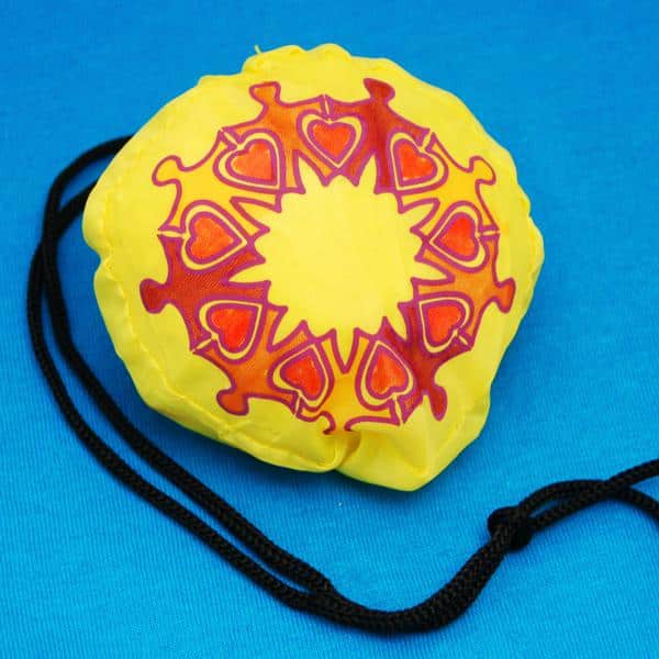 HINT: Put a sheet of paper or cardboard inside the bag before coloring it, so the ink doesn’t bleed through. Test colors on the handle to see how they will look on the yellow. For complex designs, draw the pattern on a piece of paper and slide it inside, then trace it.