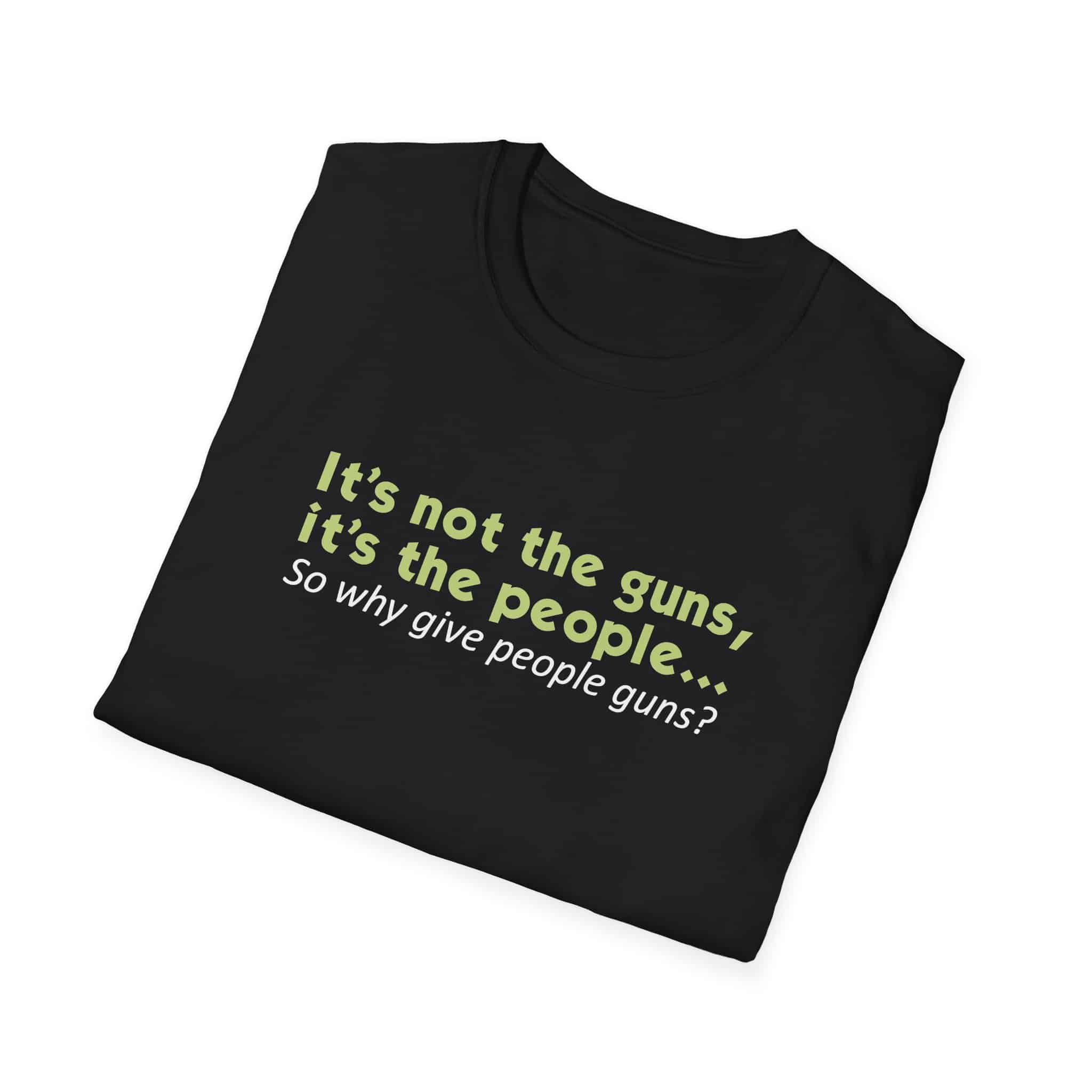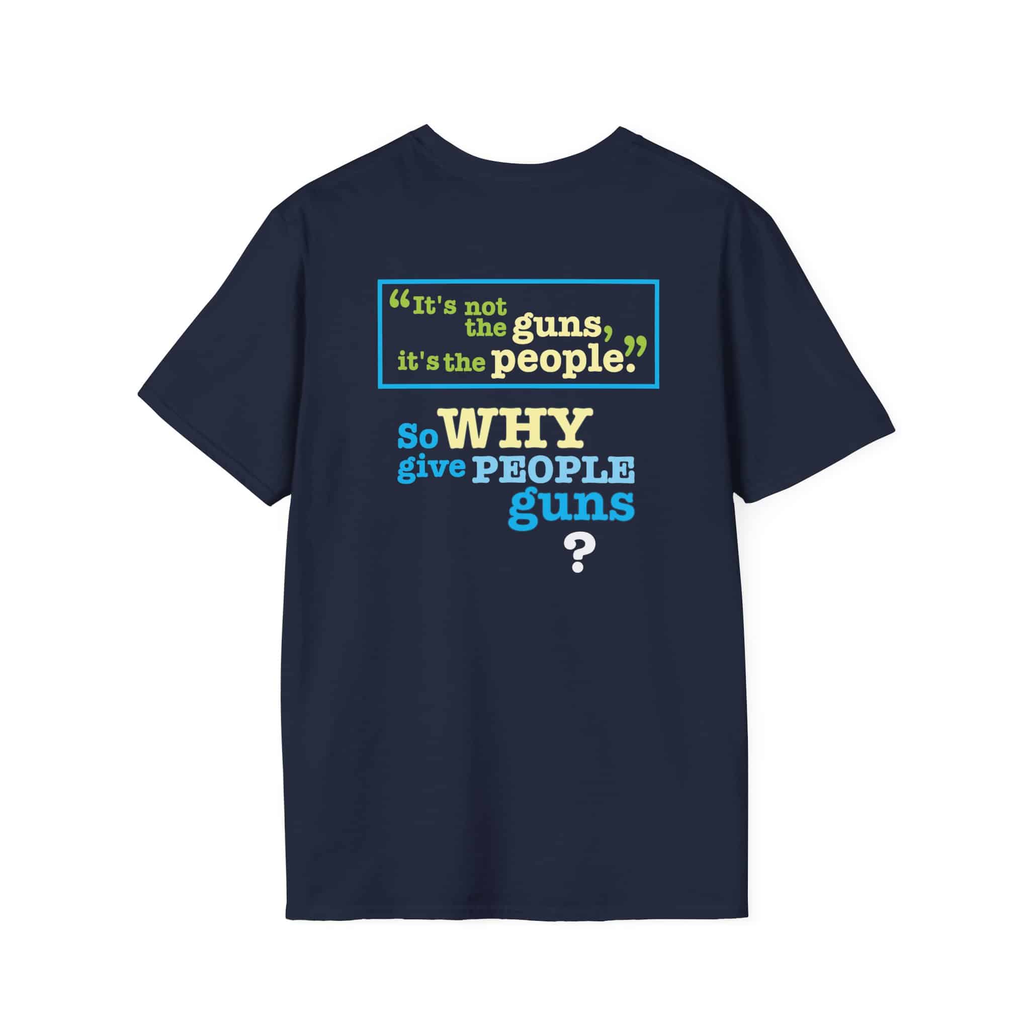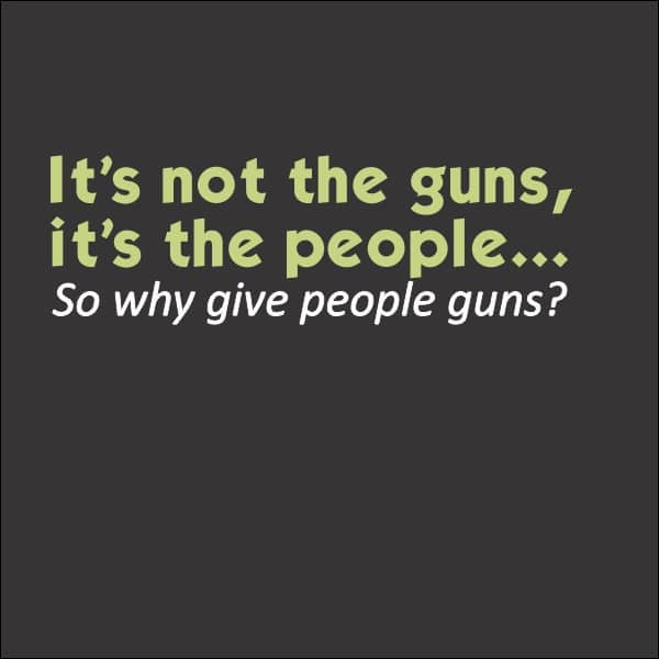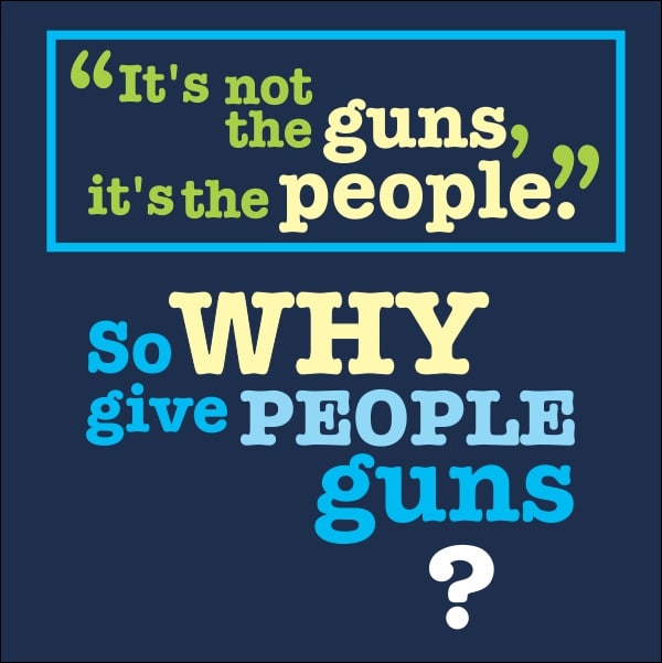 One of the most common rebuttals to attempts to pass gun control laws is that “Guns don’t kill people; people kill people.” Our T-shirt expresses this as, “It’s not the guns, it’s the people.” This absurd statement has a very simple response – so why give people guns?